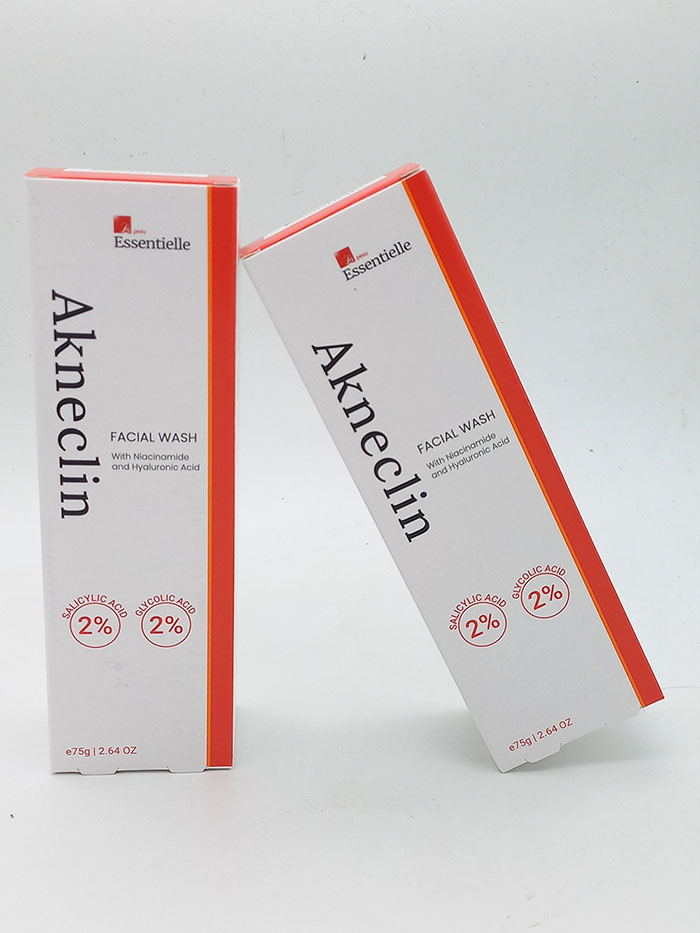 Akneclin Facial Wash is tailored for oily and acne-prone skin. It combines 2% salicylic acid and 2% glycolic acid to help unclog pores and exfoliate dead cells, while niacinamide works to calm inflammation and regulate sebum, and hyaluronic acid helps maintain hydration. The wash aims to prevent breakouts, smooth skin texture, and support clearer skin with regular use.